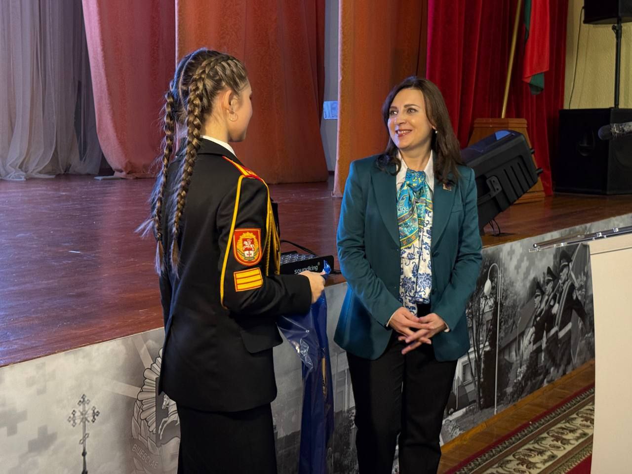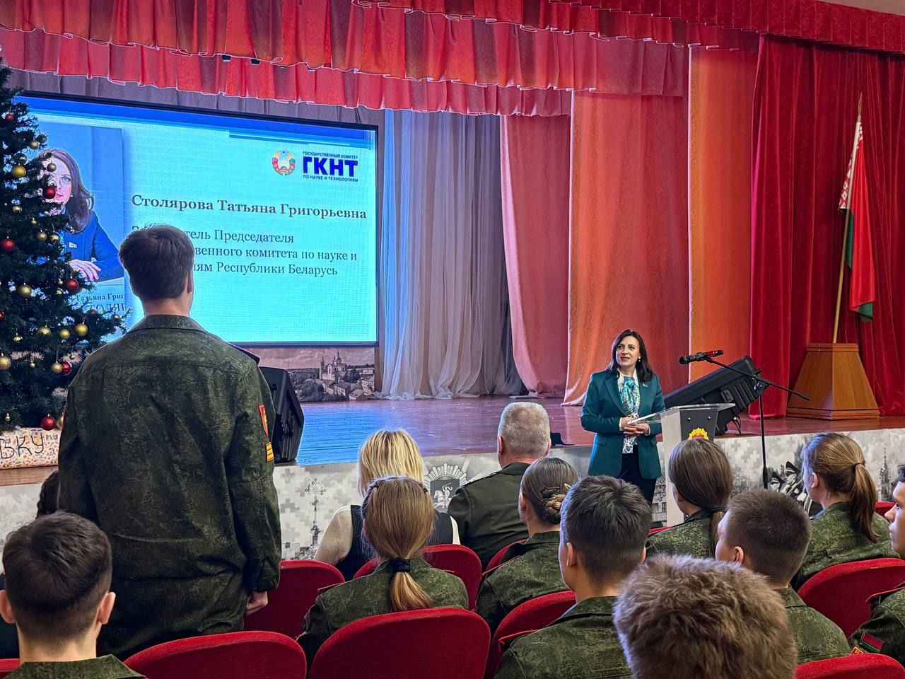 В актовом зале училища заместитель Председателя Государственного комитета по науке и технологиям Cтолярова Татьяна Григорьевна пообщалась с кадетами. Значимые совместные проекты Беларуси и России в научно-технической сфере, женщина-политик в современном мире, школа будущего – эти и другие темы были интересны учащимся.