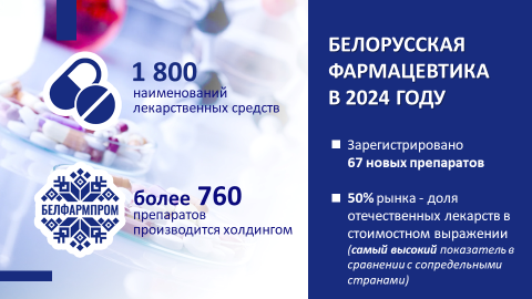 Фармацевтической отраслью обеспечивается полный спектр отечественных лекарственных препаратов, изделий медицинского назначения, а также доступ к импортным лекарствам. Доля белорусских препаратов на внутреннем рынке в стоимостном выражении поддерживается на уровне не ниже 50%, что является одним из самых высоких показателей по сравнению с внутренними рынками сопредельных государств.