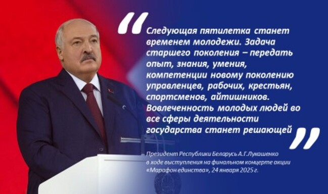 Подводя итог, можно утверждать, что сегодня со стороны государства сделана ставка на молодое поколение страны. Подтверждают это и слова Президента Республики Беларусь, сказанные им на финальном концерте акции «Марафон единства» 24 января 2025 г.: «Следующая пятилетка станет временем молодежи. Задача старшего поколения – передать опыт, знания, умения, компетенции новому поколению управленцев, рабочих, крестьян, спортсменов, айтишников. Вовлеченность молодых людей во все сферы деятельности государства станет решающей».