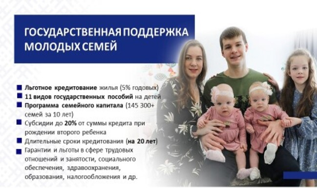 Достойная материальная поддержка семей при рождении и воспитании детей. С 1 января 2025 г. существенно увеличился минимальный размер пособия по беременности и родам. Помощь в решении жилищных вопросов молодым и многодетным семьям. Трудовые гарантии для работающих родителей: введен отцовский отпуск и дистанционная занятость.