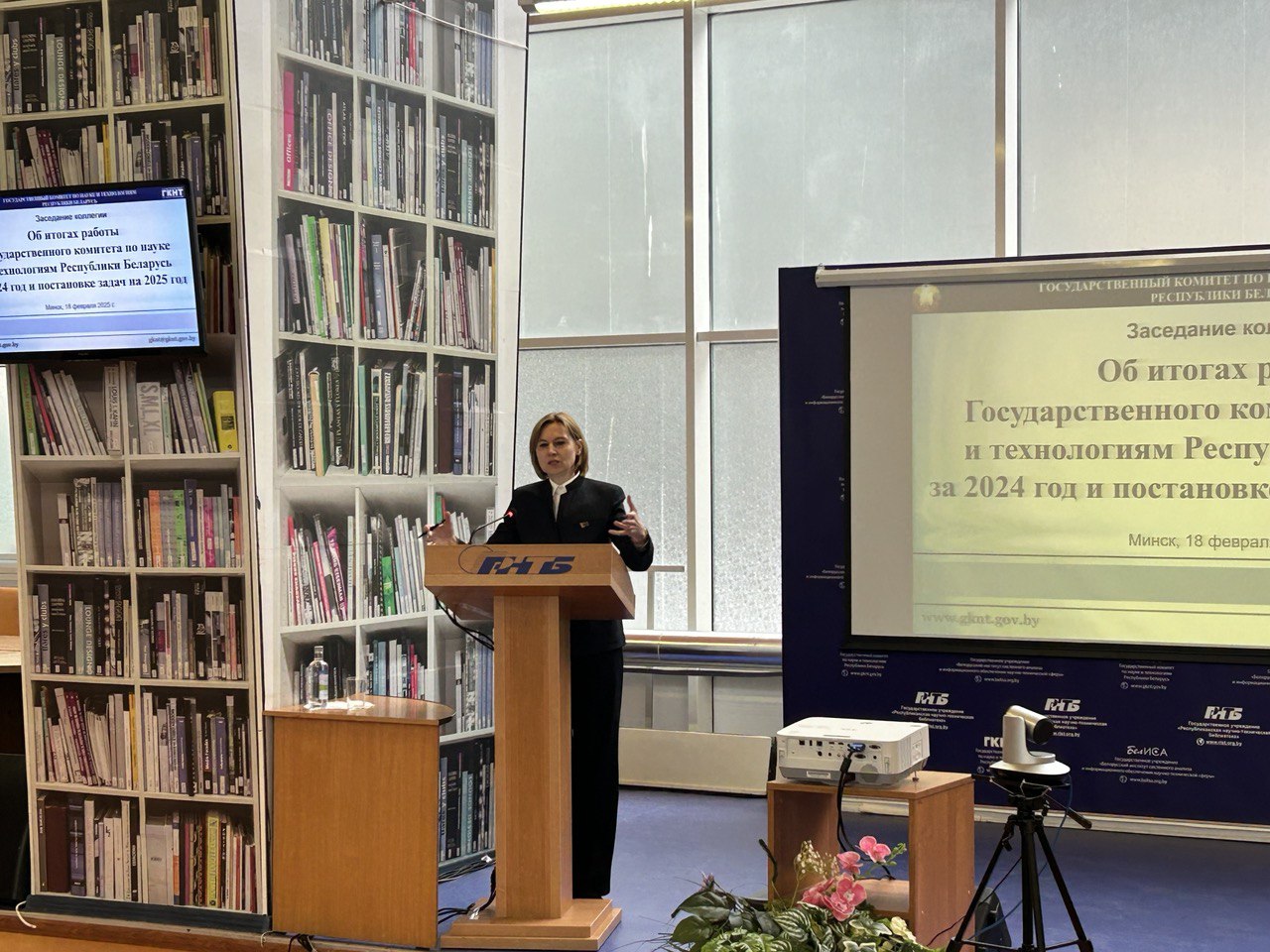 Заседание коллегии ГКНТ прошло 18 февраля 2025 года на базе Республиканской научно-технической библиотеки с участием Первого заместителя Главы Администрации Президента Республики Беларусь Натальи Петкевич.