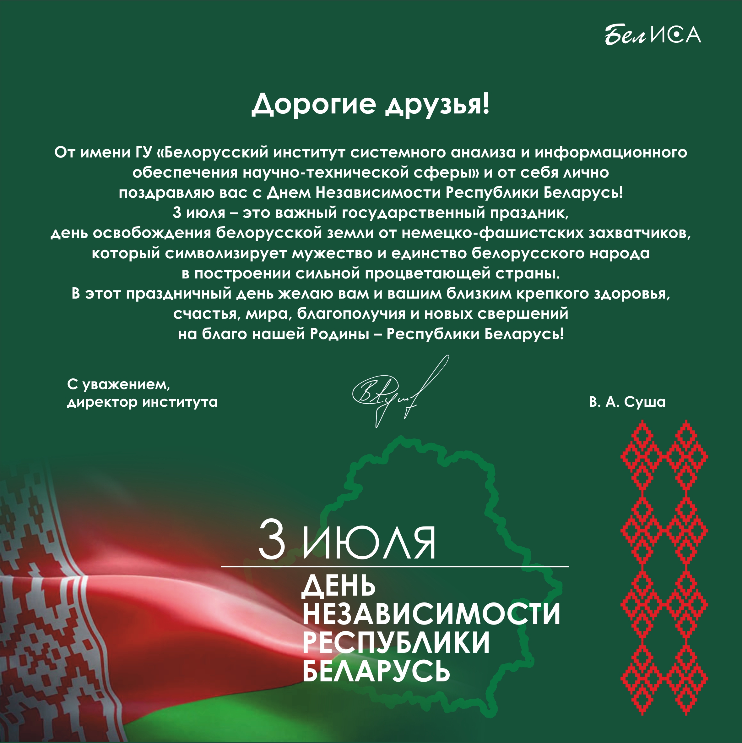 Поздравление директора ГУ «БелИСА» Владимира Александровича Суша с Днем Независимости Республики Беларусь