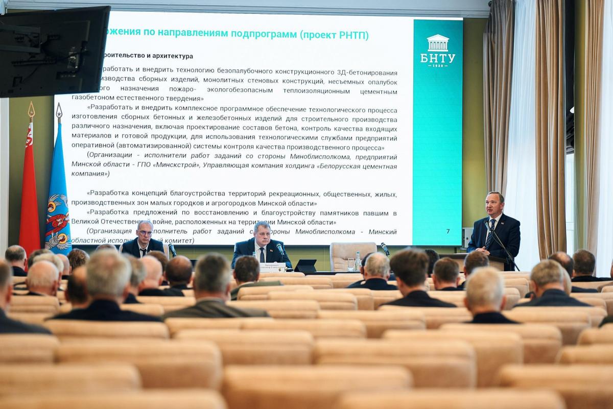 Ректор БНТУ Сергей Харитончик презентовал присутствующим информацию о перспективных проектах заданий для формирования и реализации региональной научно-технической программы Минской области на 2026–2030 годы.