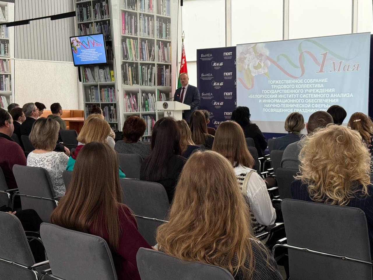 В ГУ «БелИСА» прошло торжественное собрание трудового коллектива, приуроченное празднику труда. Директор института Владимир Суша выступил с приветственным словом и кратким напоминанием об истории праздника.