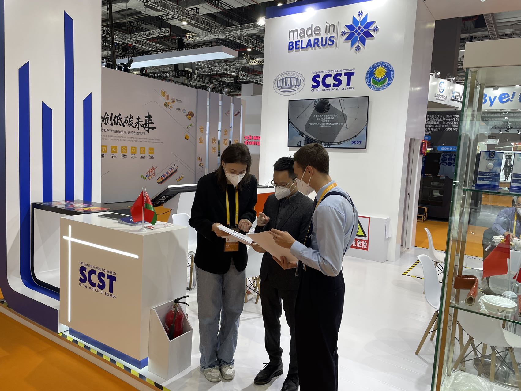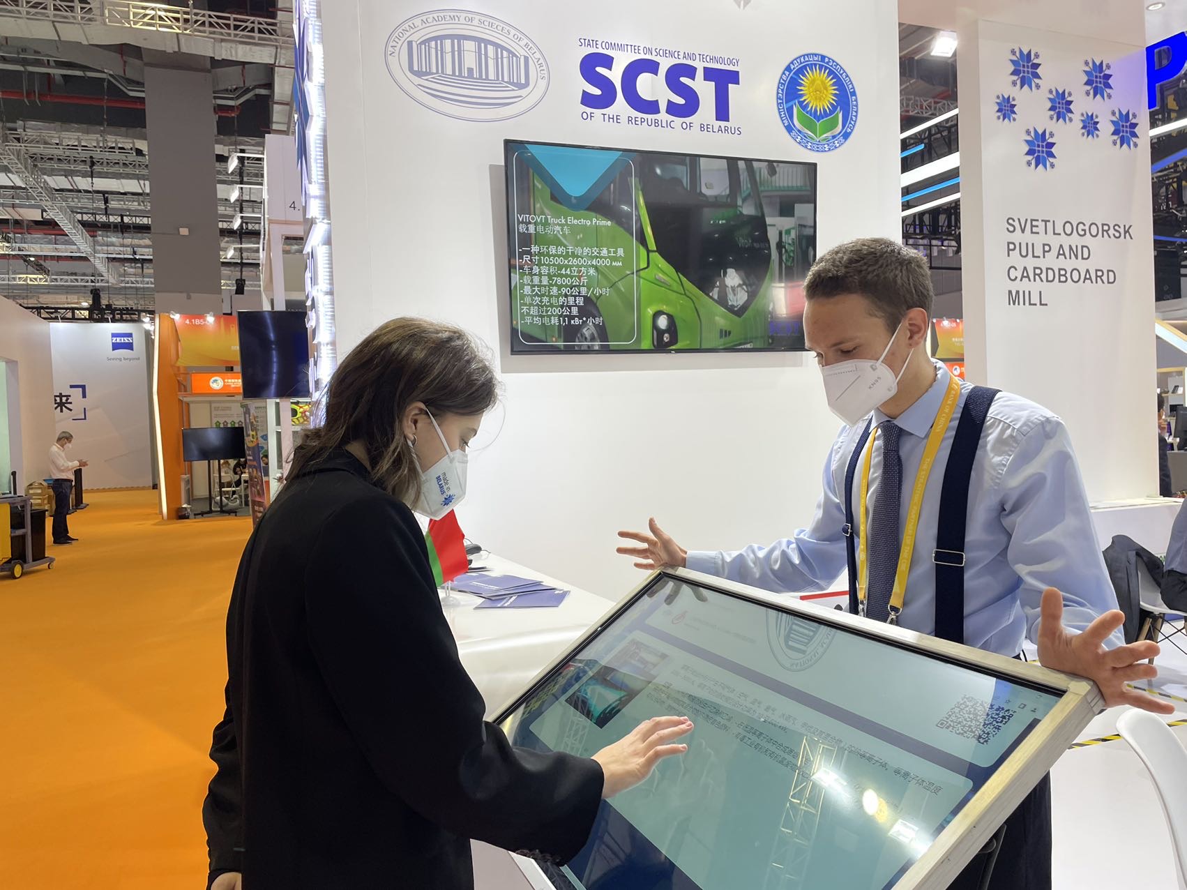 Вследствие карантинных мер, связанных с распространением коронавирусной инфекции COVID-19, участие наших представителей в разделе научно-технических разработок национальной экспозиции осуществлялось в онлайн-режиме. Описание 126 научно-технических разработок белорусских ученых из 32 организаций Национальной академии наук Беларуси и учреждений Министерства образования Республики Беларусь и контактные данные разработчиков были представлены в интерактивном информационном киоске, размещенном в страновом павильоне «Высокотехнологическое оборудование и информационные технологии».