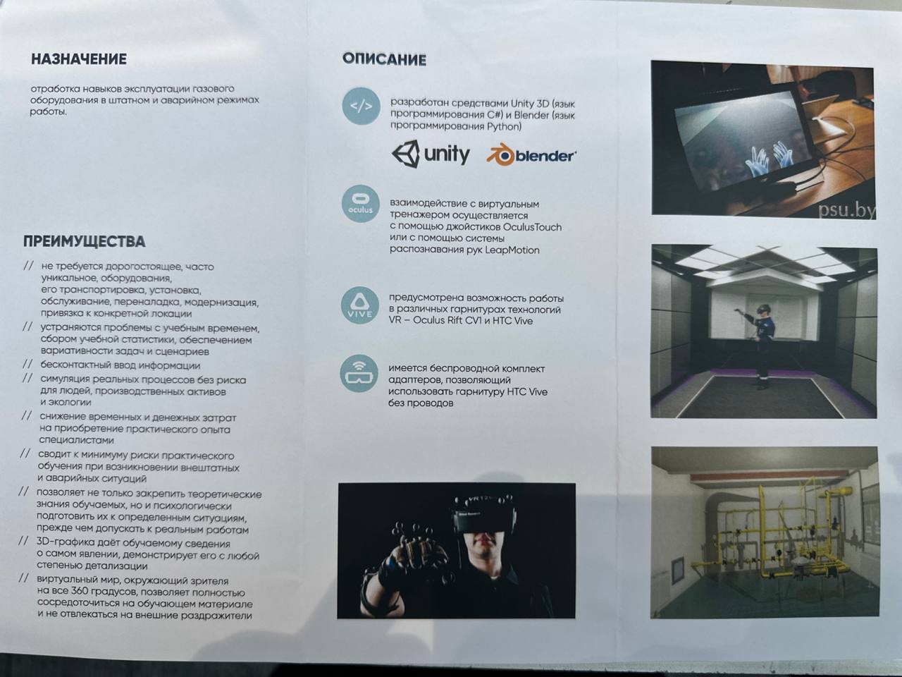 виртуальный тренажер для специалистов по обслуживанию и ремонту объектов газораспределительной системы и газопотребления применяется для отработки определённых умений и навыков у специалистов, обслуживающих городские газораспределительные пункты (УО «Полоцкий государственный университет имени Евфросинии Полоцкой»);