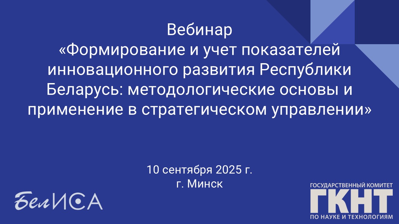 Государственное учреждение «Белорусский институт системного анализа и информационного обеспечения научно-технической сферы» 10 сентября 2025 года проводит вебинар «Формирование и учет показателей инновационного развития Республики Беларусь: методологические основы и применение в стратегическом управлении» с использованием видеосвязи в формате видеоконференции.